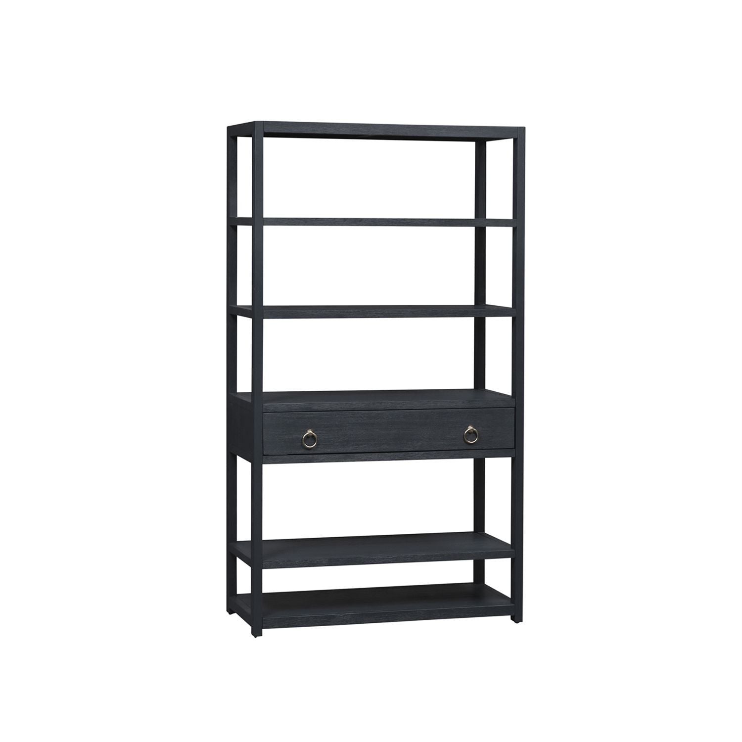 Turn your house into a home with the eclectic East End accent bookcase. Crafted of Acacia Solids and veneers, this piece features a wire brushed finish accented with brass ring hardware. This bookshelf offers six shelves for storage and display as well as a full extension drawer for additional storage. This piece is versatile enough to work in any room and transform the ordinary into the extraordinary. Unique and timeless, allow the East End accent bookcase to bring inspirational design into your home.